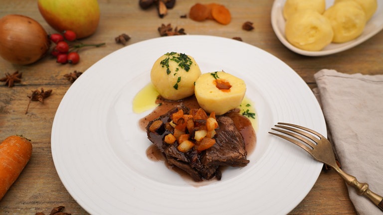 24. Je 2 Knödeln zum Fleisch anrichten, mit der Hagebutten-Schmelze beträufeln und servieren. Übrige Sauce extra reichen.