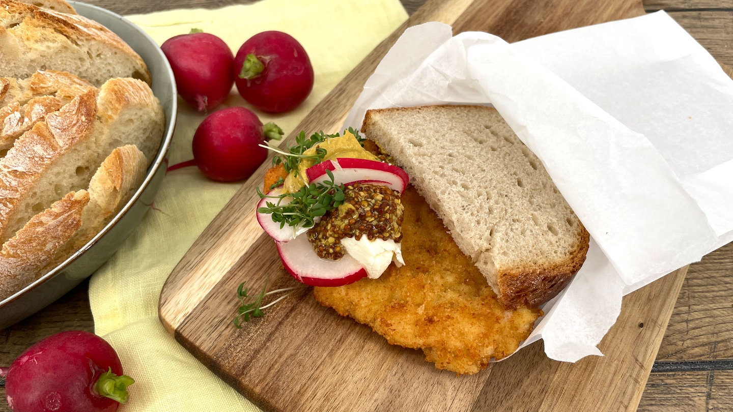 10. Die Hälfte der Brotscheiben mit etwas Kresse bestreuen, mit einigen Radieschen und den Schnitzeln belegen. Darauf restliche Kresse und Radieschen geben und mit den übrigen Brotscheiben abdecken. Die belegten Brote halbieren und genießen.