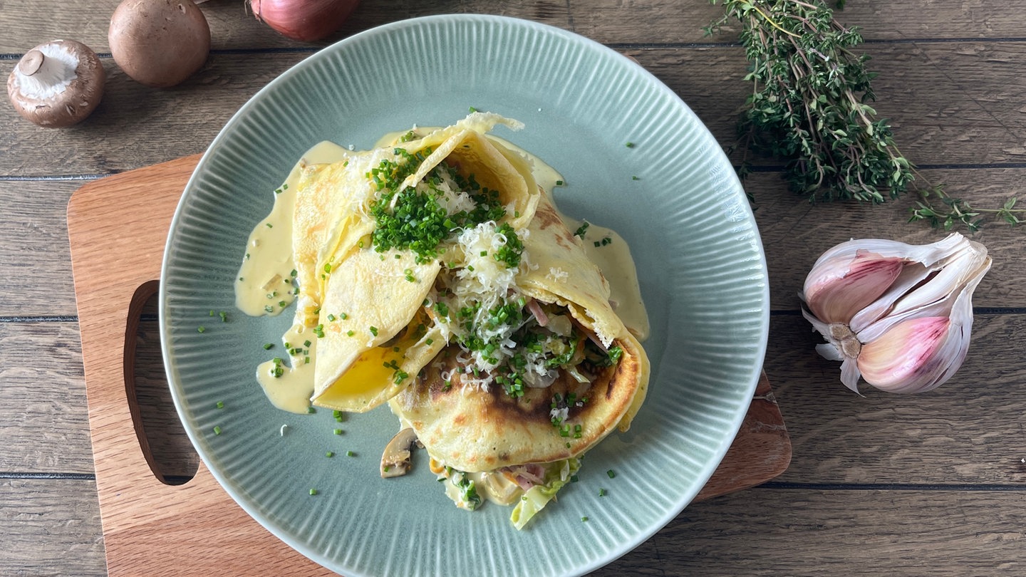 9. Pfannkuchen mit dem Gemüse füllen, Schnittlauch darüberstreuen und servieren.