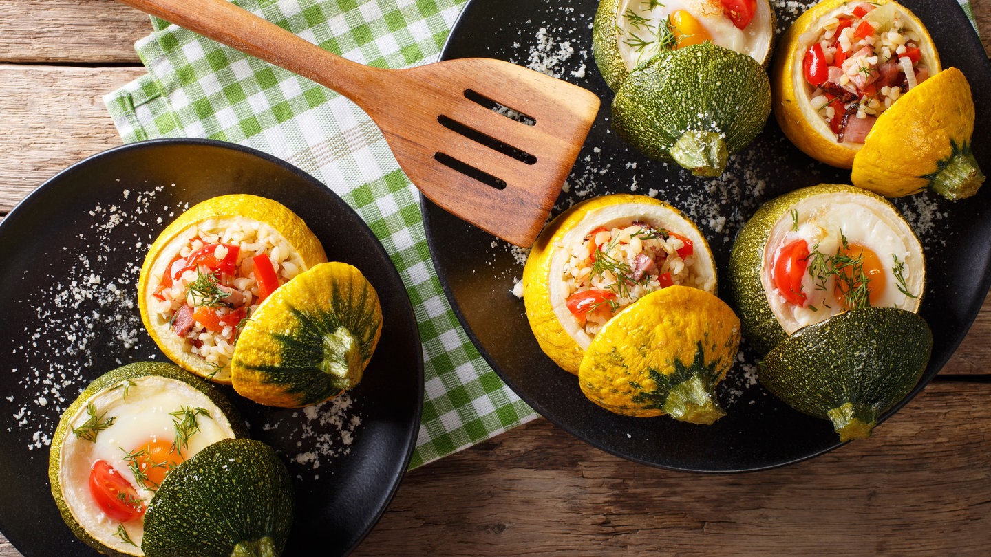 1. Für das Sommergemüse die Zucchini und Spitzpaprika abbrausen und trocknen. Zucchini der Länge nach halbieren und mit einem Teelöffel aushöhlen, Inneres in einen Rührbecher geben und beiseitestellen. Paprika der Länge nach halbieren und entkernen. Zucchini und Paprika innen leicht salzen.