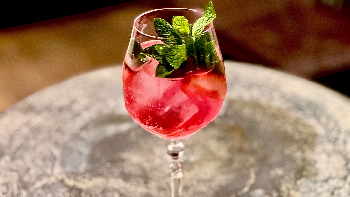 2. Dann in ein bauchiges Weinglas mit Eis abseihen und mit Sekt aufgießen.