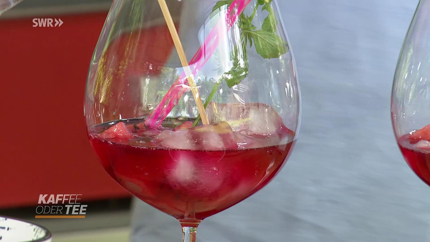 7. Die gefrorenen Melonenwürfel und den Eistee in Gläser (à etwa 300 ml Inhalt) geben und mit je einem Zweig Pfefferminze oder Zitronenmelisse und je einem Holzspieß und Strohhalm garnieren.