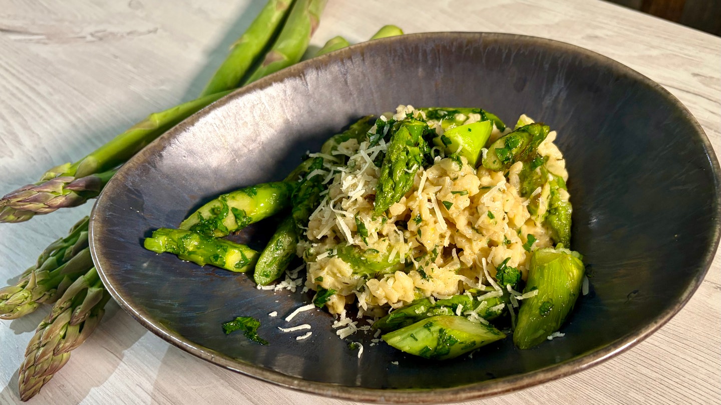 Etwa die Hälfte des Spargels unter das Risotto heben. Dann Risotto in einen tiefen Teller geben und den restlichen Spargel rundherum anrichten. Etwas Parmesan darüber geben zum Garnieren.