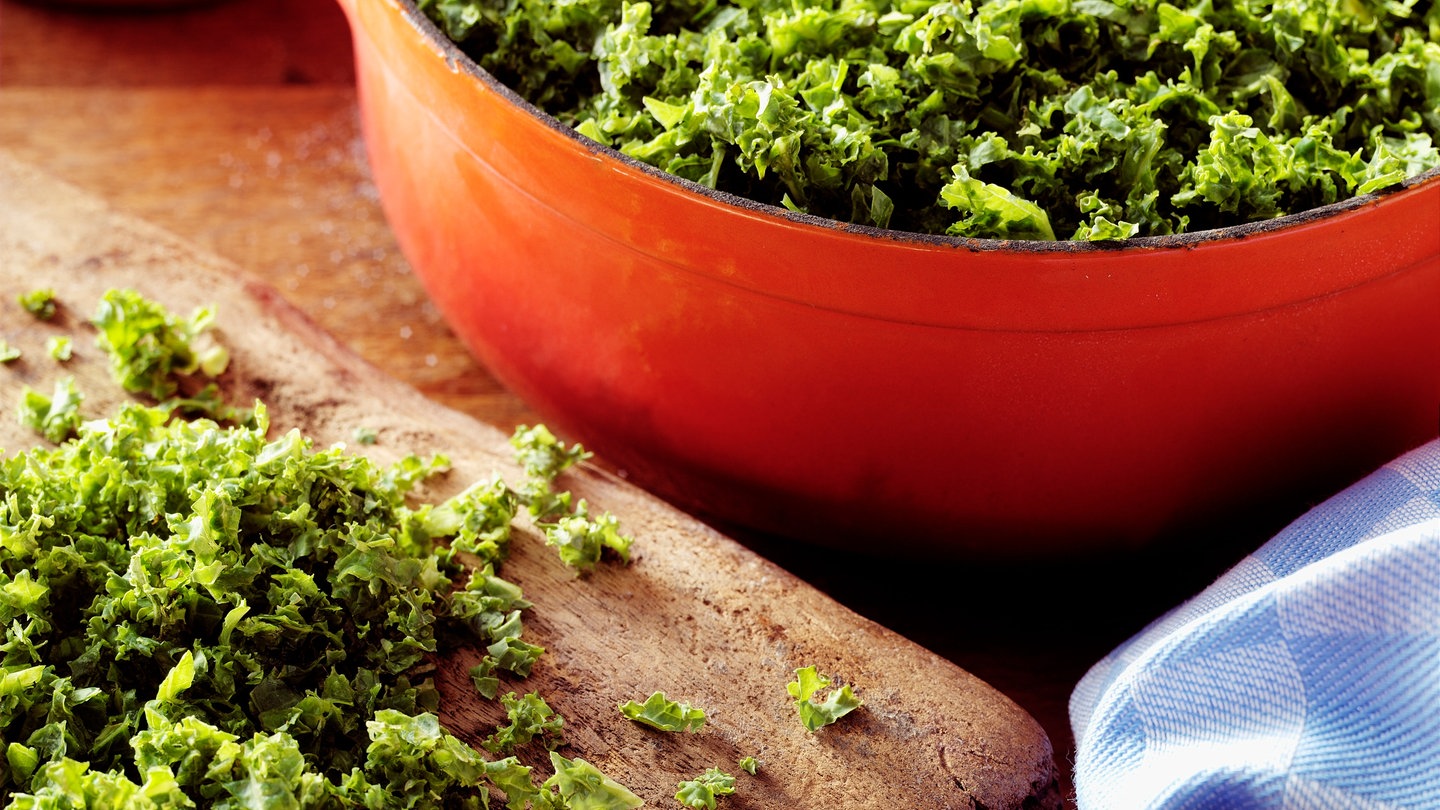 2. Für die Füllung: Grünkohl waschen, trocken tupfen und den dicken Strunk der Blätter rausschneiden. Grünkohl hacken.