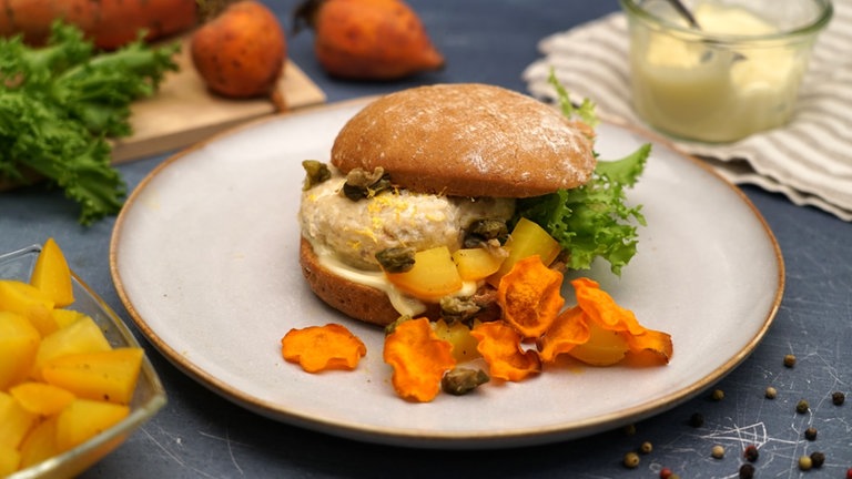 20. Die Frikadellen aus dem Kochwasser nehmen, auf Küchenpapier abtropfen und auf das vorbereitete Brötchen geben. Dann nochmals Mayonnaise, gelbe Bete und Friséesalat darauf schichten und mit dem Brötchendeckel bedecken.