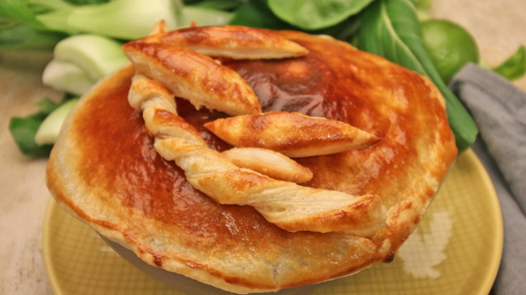 Ragout ist 80er? Nicht bei uns! Wir nehmen Huhn und viel Buntes vom Markt und geben dem Ganzen eine krosse Mütze aus Blätterteig - ein Hingucker!