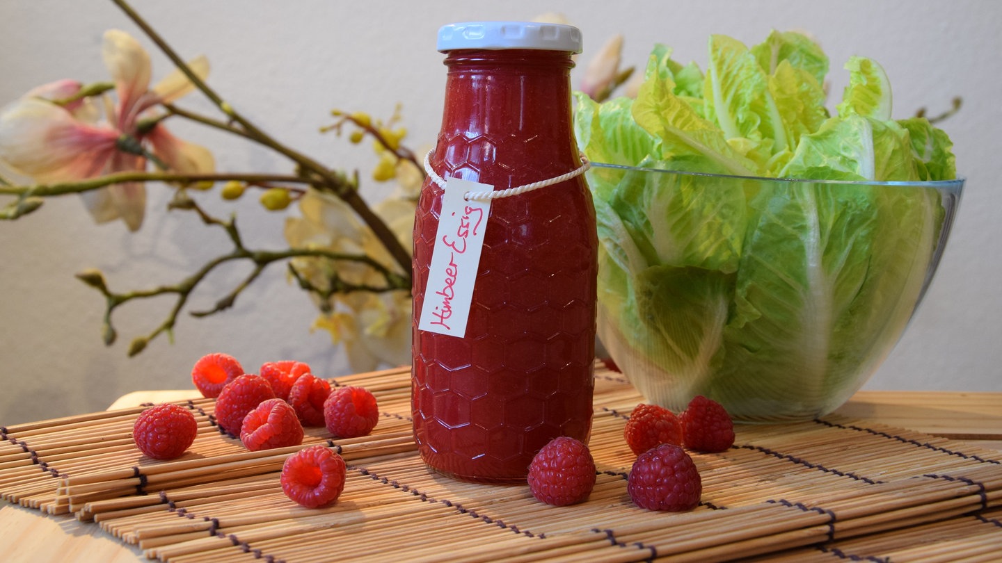 Die Himbeerkerne mit 10 g Zucker in ein Schraubglas geben und mit Essig begießen. 3-4 Tage bei Zimmertemperatur stehen lassen, dann durch ein Sieb seihen. Den aufgefangenen Essig in eine Flasche füllen.