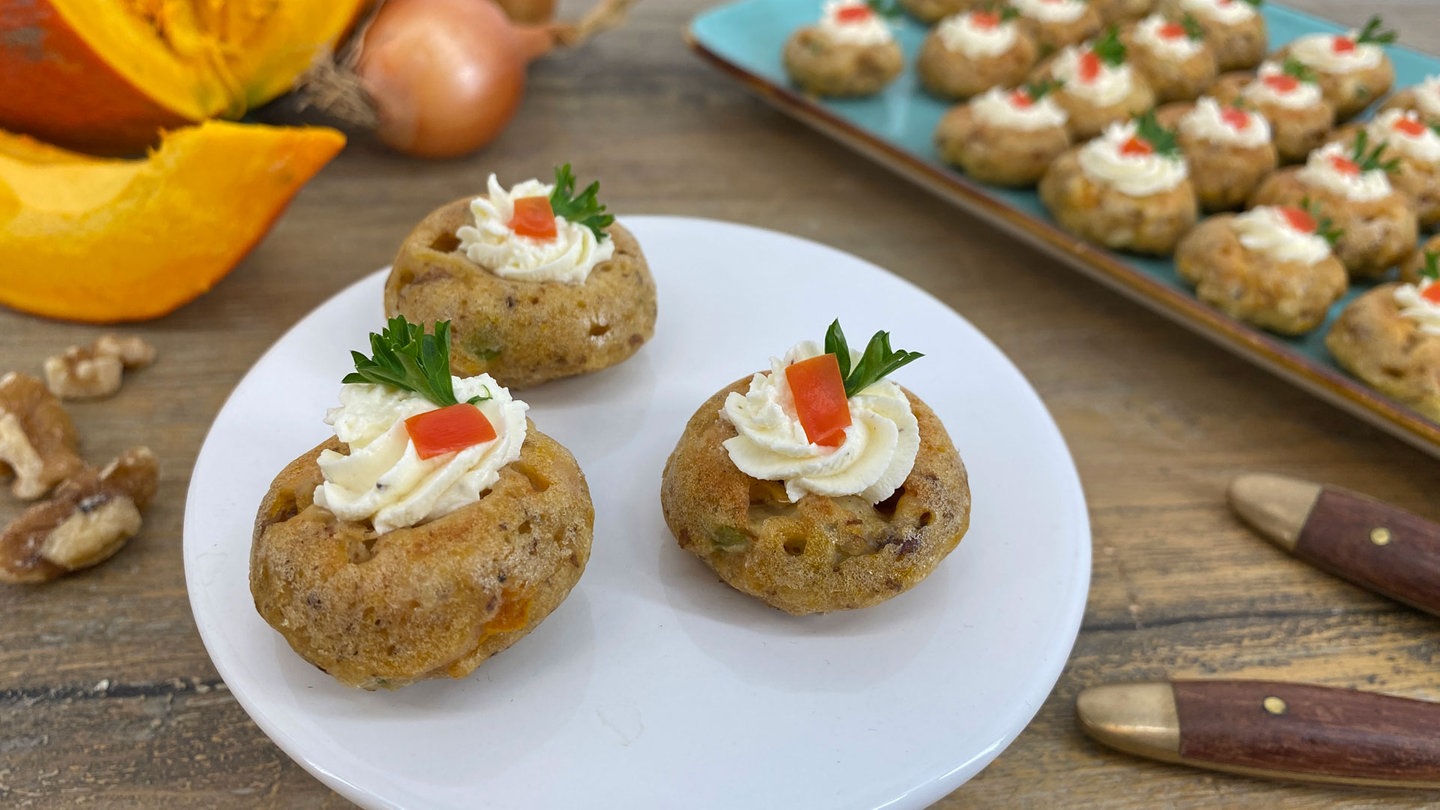 11. Muffins mit Frischkäse, Petersilie und kleinen Stücken von z.B. Paprika, Walnusskernen, Staudensellerie oder Hokkaido-Kürbis nach Belieben garnieren.
