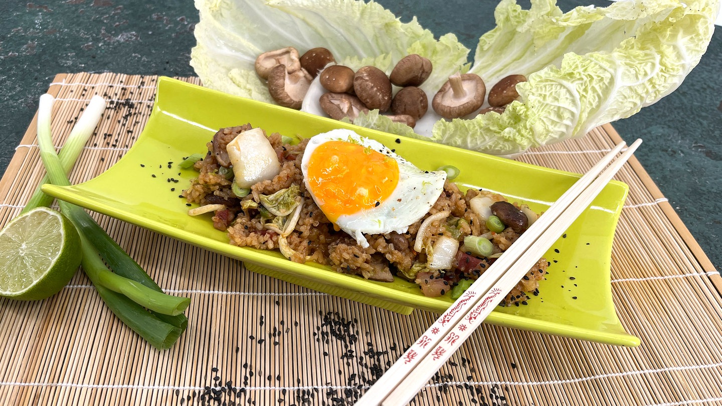 19. Die Reispfanne auf Tellern anrichten, darauf jeweils ein Spiegelei geben und mit Sesam und Frühlingslauch garnieren.