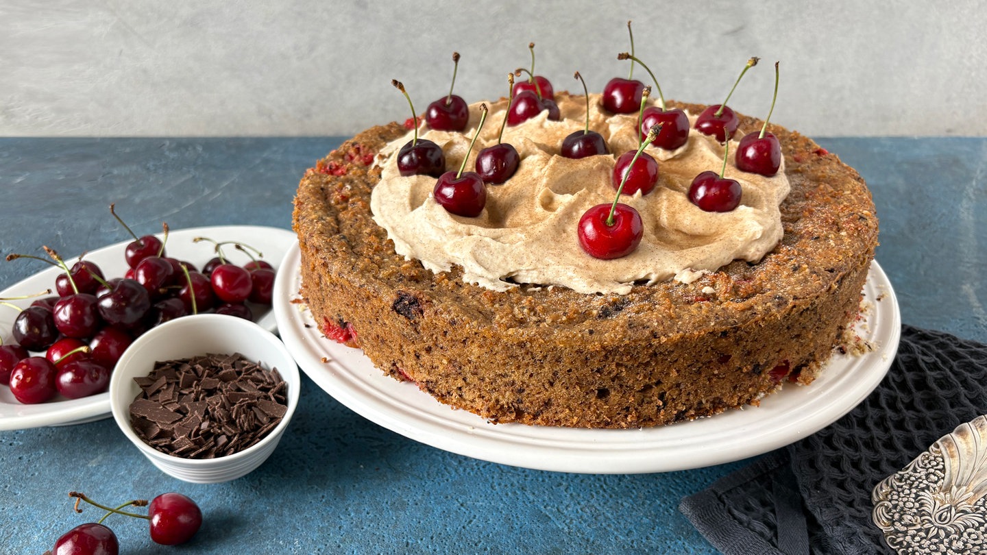 12. Den Plotzer vorsichtig aus der Form lösen, das Backpapier entfernen und den Plotzer auf eine Tortenplatte setzen. Gewürzsahne mit einem Silikonschaber darauf verteilen und den Plotzer in Stücke schneiden.