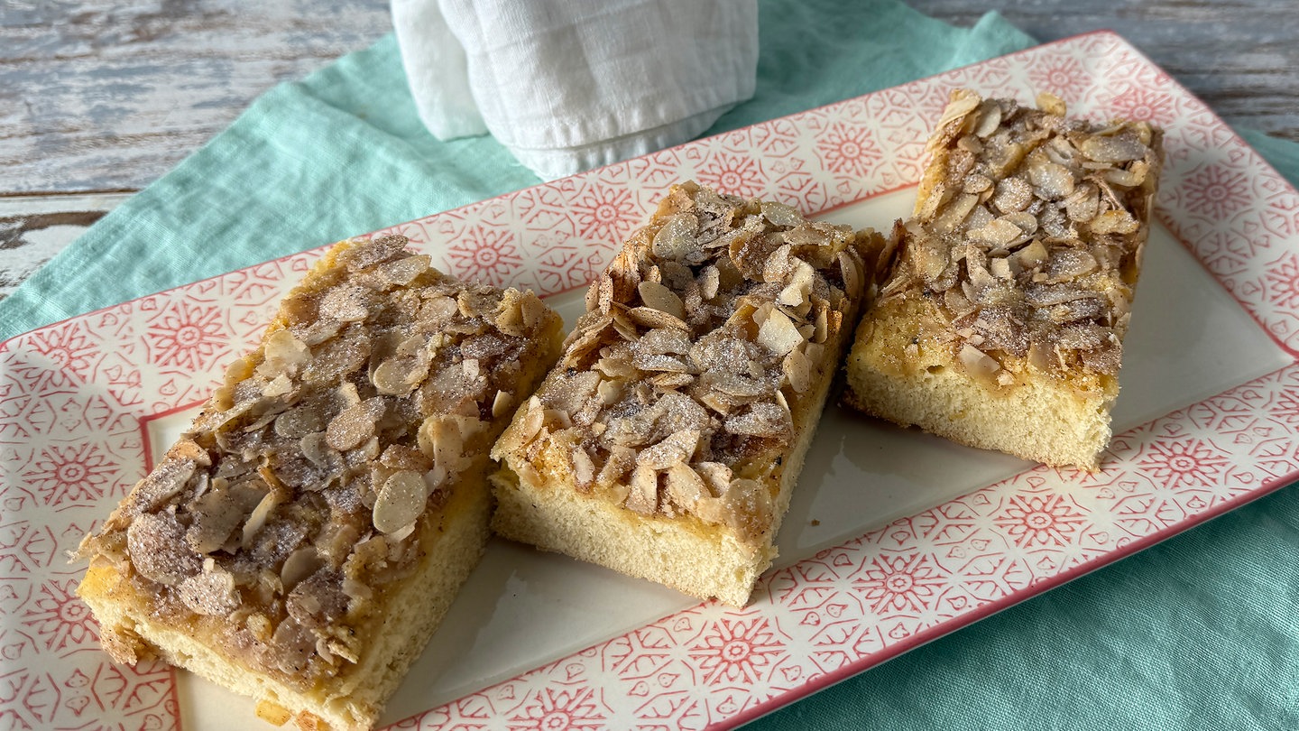 16. Den Kuchen auf dem Blech auf einem Gitter 15-20 Minuten abkühlen lassen und in Stücke (à ca. 7 x 12 cm) schneiden. Lauwarm schmeckt der Butterkuchen am allerbesten.