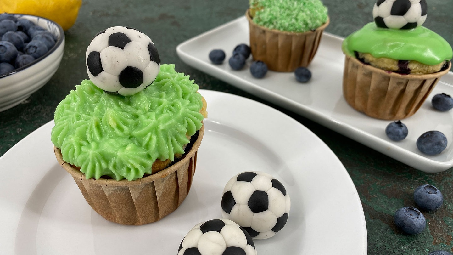 23. Nach Belieben Zahnstocher in die Muffins stecken und die Bälle damit im Gras-Topping fixieren.