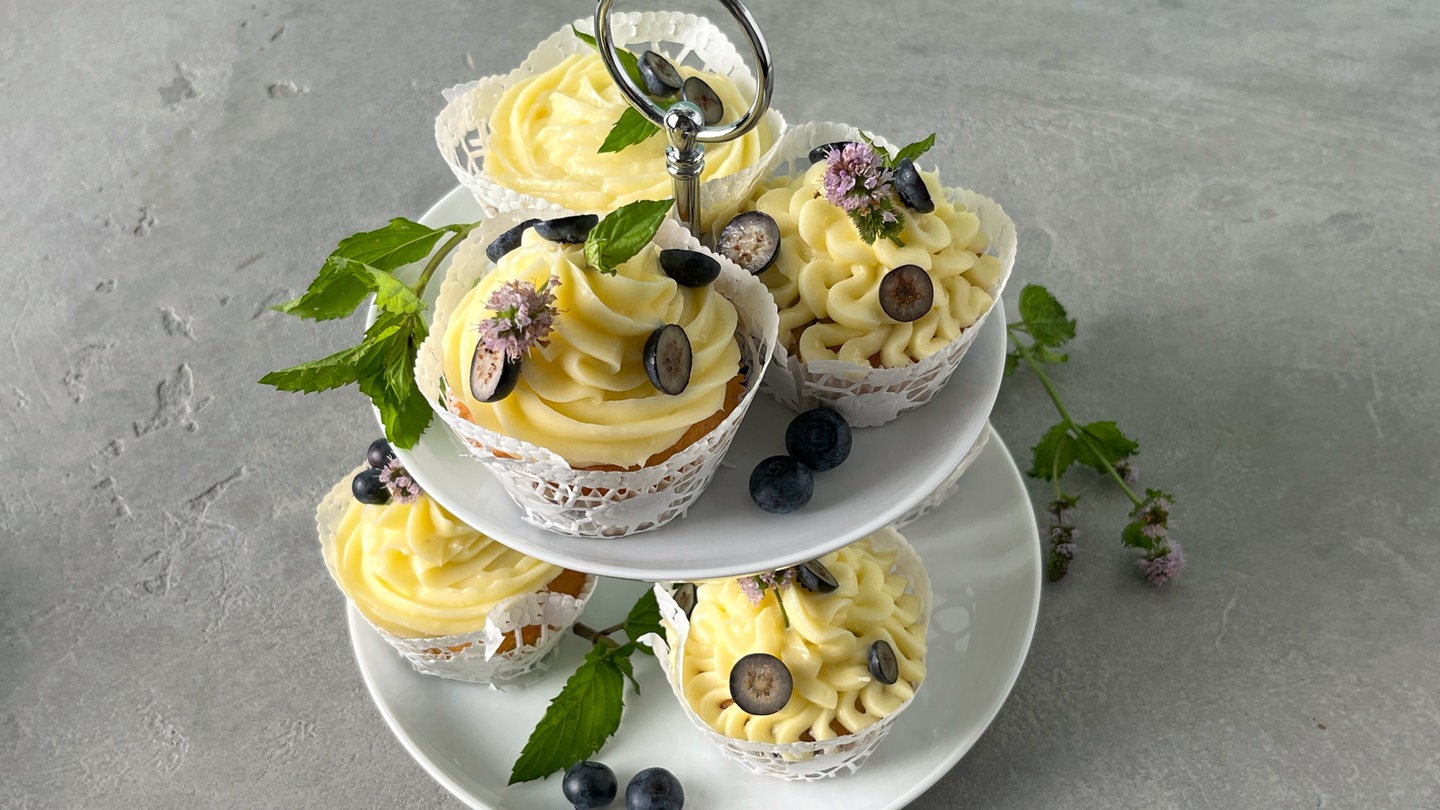 14. Die Cupcakes mit frischen Heidelbeeren und Minzblättern verzieren.