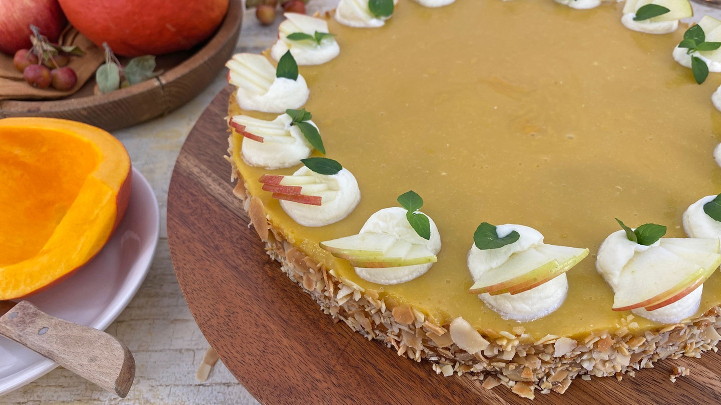 19. Tortenring vorsichtig vom Kürbiskuchen lösen und auf eine Platte setzen. Kuchen in 14 Stücke einteilen und auf jedes Stück eine Sahnerosette dressieren und mit jeweils einem Apfelstückchen ausgarnieren. Kuchen portionieren und servieren.