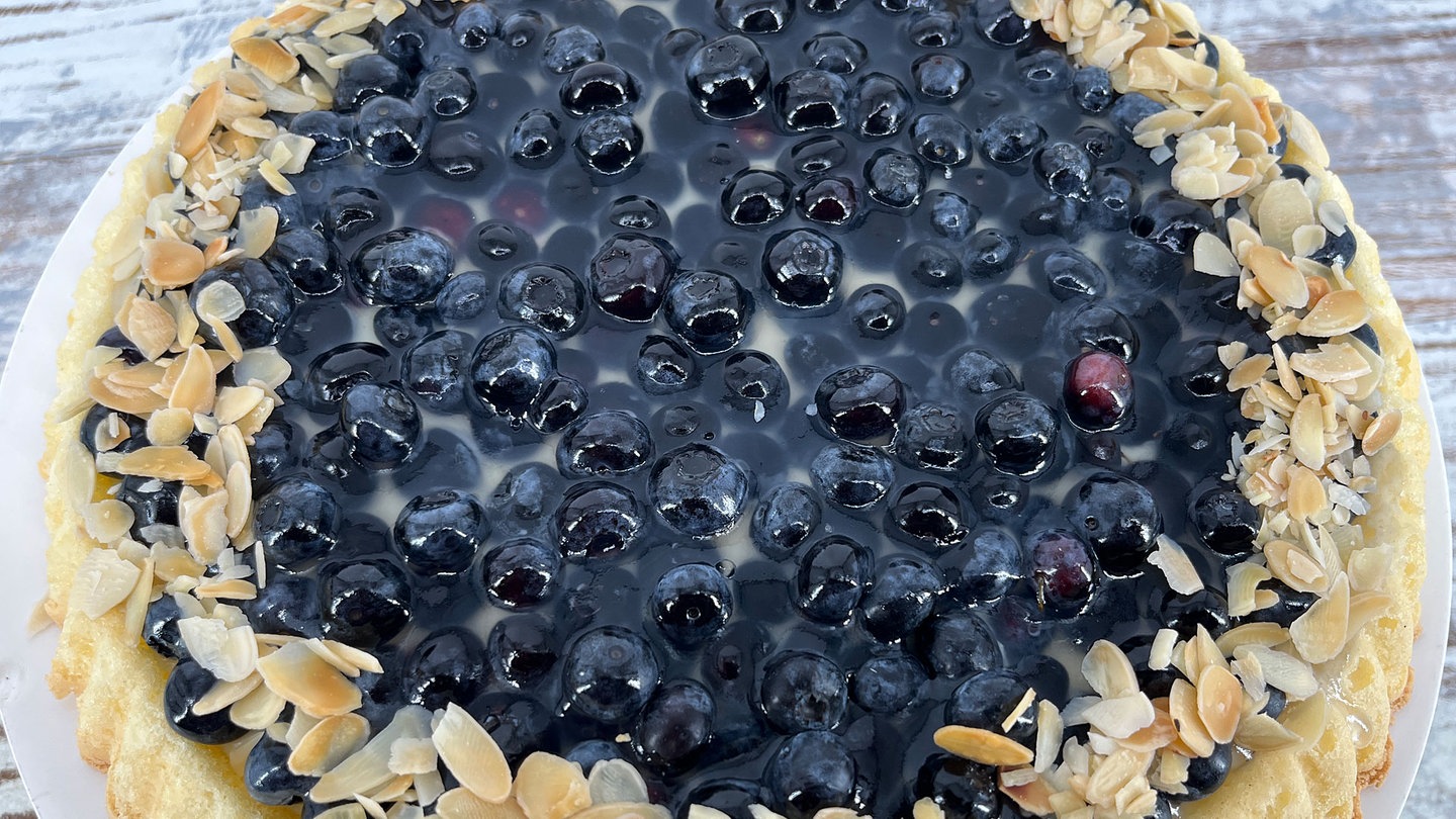 6. Im heißen Ofen auf dem Blech in der Ofenmitte etwa 10 Minuten goldgelb backen. Mürbeteigboden auf dem Blech auf einem Gitter abkühlen lassen.