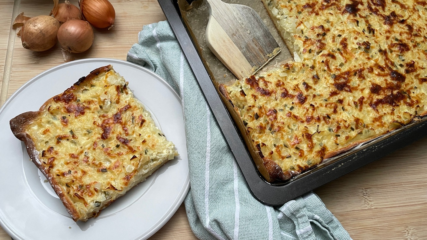 12. Den Zwiebelkuchen aus dem Ofen nehmen, Blech auf ein Kuchengitter setzen. Vor dem Anschneiden kurz ruhen lassen. Am besten schmeckt der Zwiebelkuchen lauwarm.