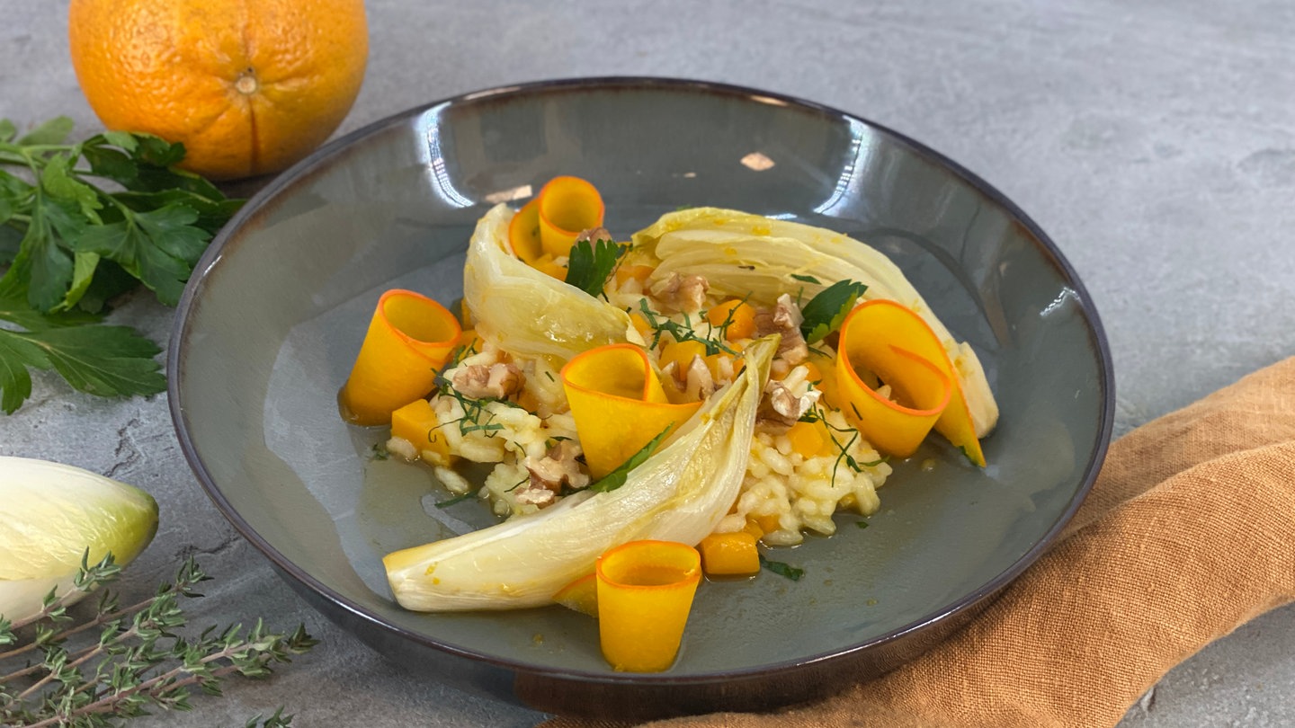 16. Risotto mit Petersilie und Walnüssen bestreuen und den Chicorée dazu servieren.