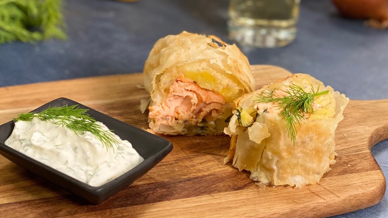 18. Den gebackenen Strudel in Stücke schneiden und mit dem Dip servieren.