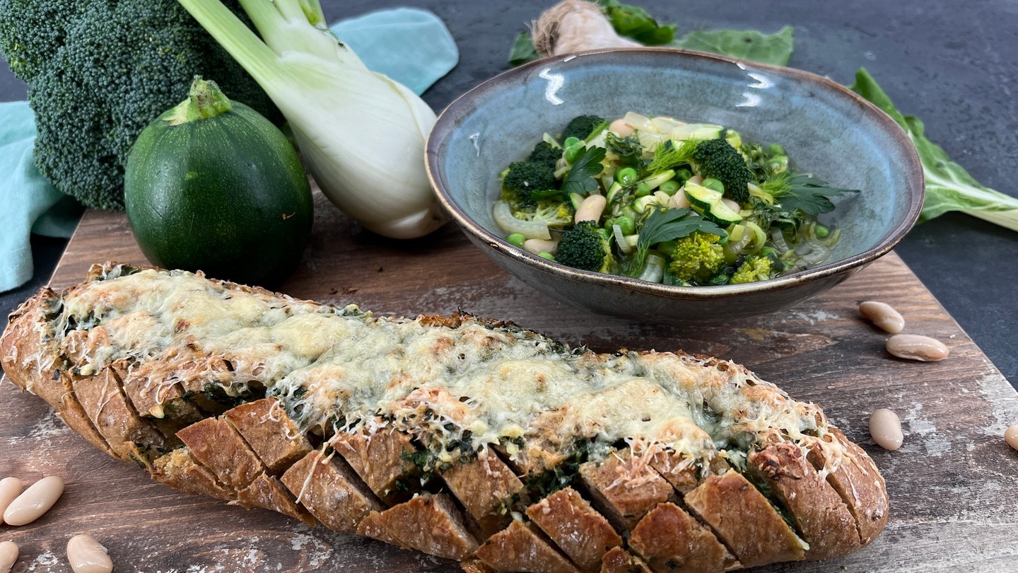 15. Baguette aus dem Ofen nehmen und in Scheiben schneiden. Minestrone erneut abschmecken. Mit dem Baguette sowie Kräuteröl anrichten und servieren.