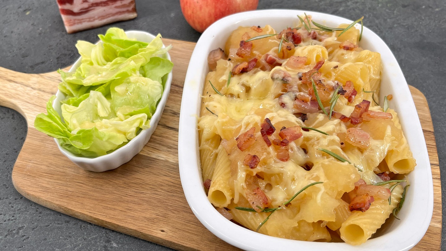 12. Das Apfelmus und die Hälfte vom geriebenen Käse zu den Nudeln geben und alles gut vermischen. Mit dem restlichen Käse bestreuen. Die restliche Butter in kleinen Flöckchen darauf verteilen und alles im vorgeheizten Ofen ca. 8 Minuten gratinieren.