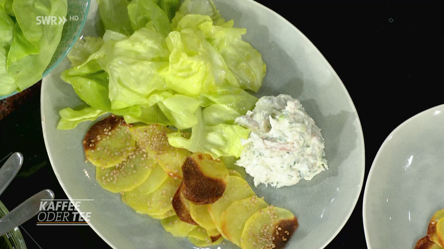 12. Kartoffeln aus dem Ofen holen. Kartoffeln mit Salat und Forellencreme anrichten und servieren.