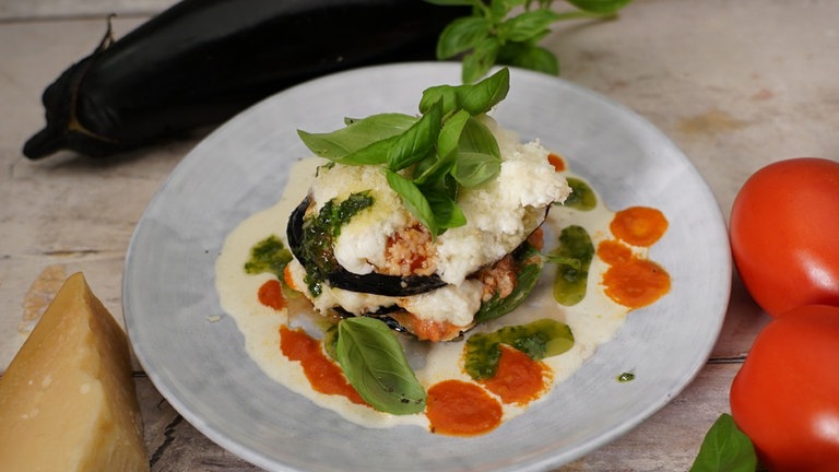 16. Die Parmigiana wird als Türmchen serviert. Dazu jeweils eine Auberginenscheibe auf Teller verteilen, mit etwas Tomatensauce bedecken, gleichmäßig jeweils etwa 1 EL geriebenen Parmesan darüber streuen. Mit etwas zerzupftem Basilikum und Mozzarella belegen. Übrige Zutaten nach und nach in gleicher Folge aufschichten, bis die gewünschte Höhe erreicht ist.