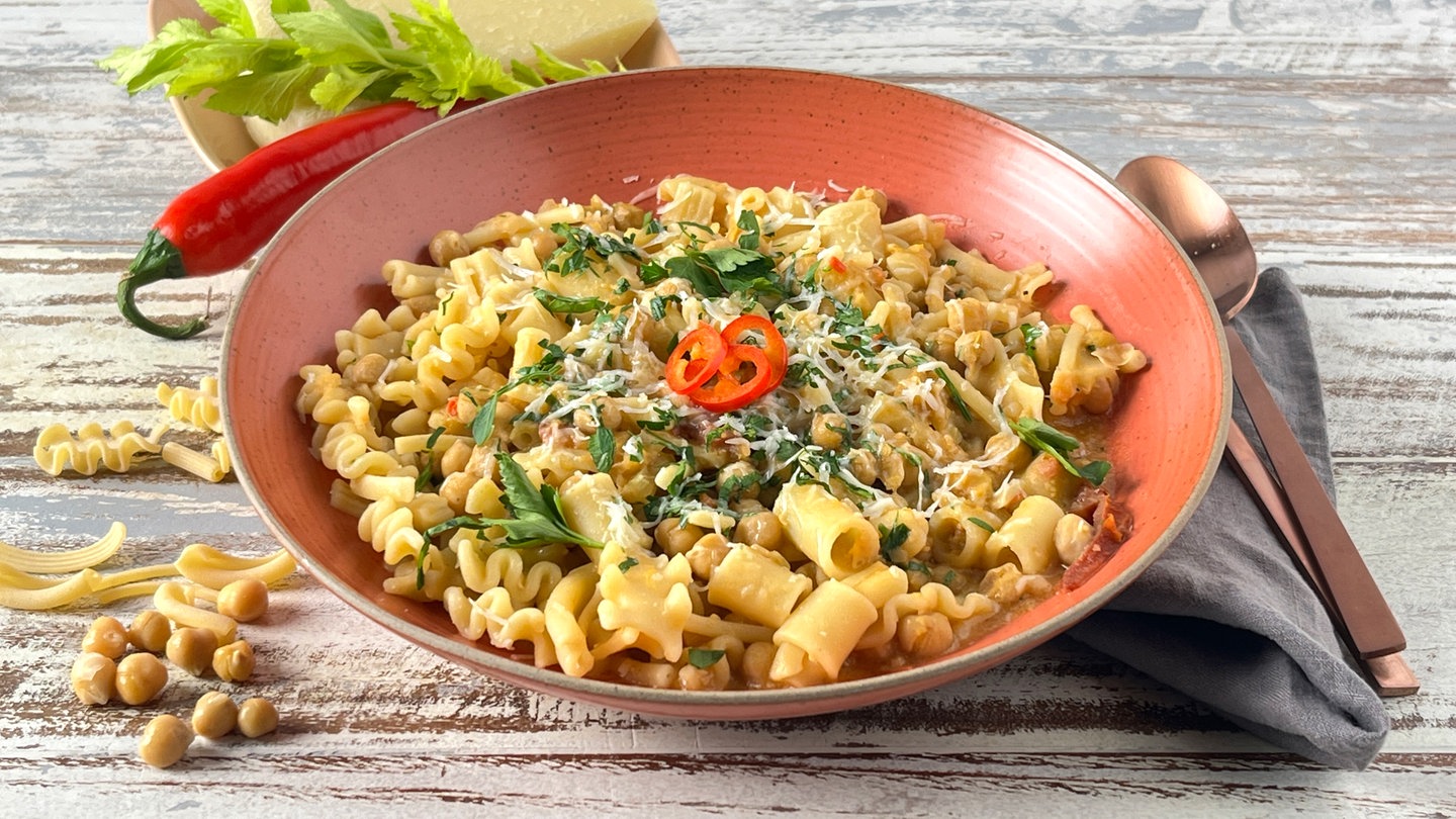8. Die Nudeln mit Kichererbsenpüree und die Hälfte der Petersilie zu den übrigen Kichererbsen in den Topf geben und vorsichtig unterrühren. Es sollte eine sämige, nicht flüssige Konsistenz entstehen (wenn es zu dickflüssig wird, noch etwas Nudelwasser oder Gemüsebrühe zugeben).