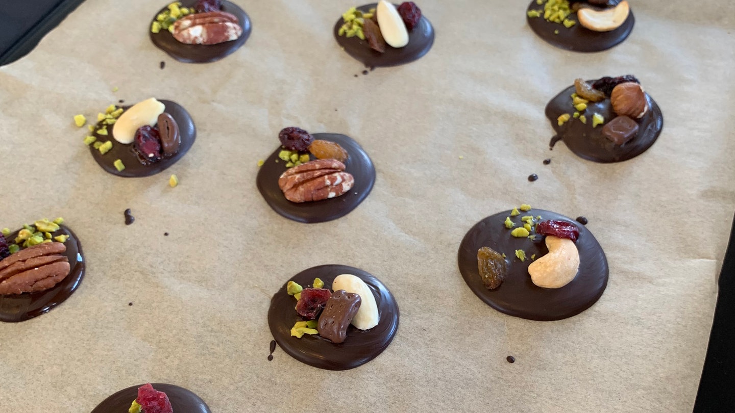 Mit einem Esslöffel etwas Schokolade kreisförmig (Talergröße) auf Backpapier geben. Darauf die Trockenfrüchte und Nüsse setzen. Komplett auskühlen lassen und kühl aufbewahren.