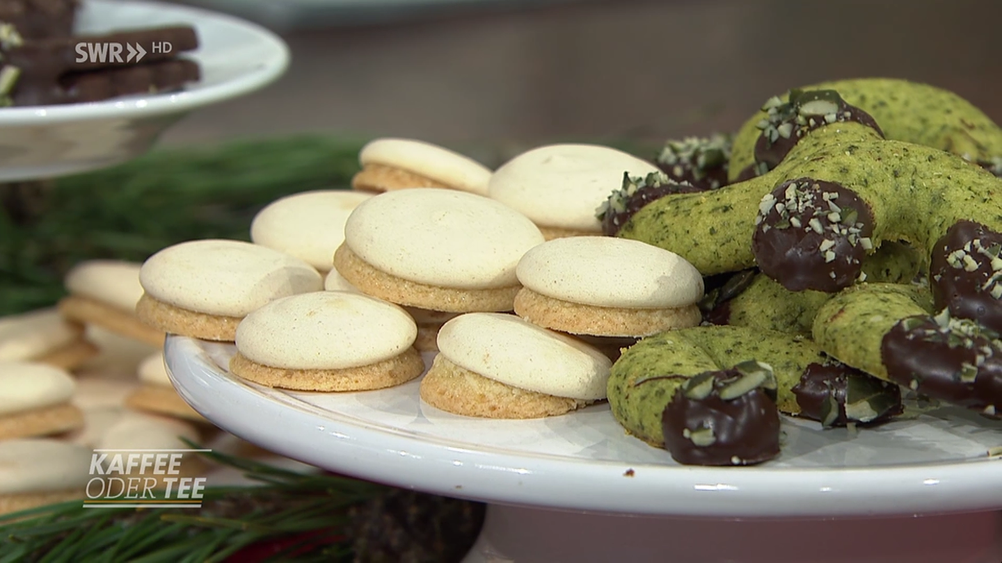 8. Schlagkessel vom Wasserbad nehmen und die zusammengesetzten Plätzchen kopfüber hineintauchen, auf einem Gitter abtropfen lassen, kurz anziehen lassen und nach Belieben mit Schokostückchen oder gehackten Pistazien dekorieren.