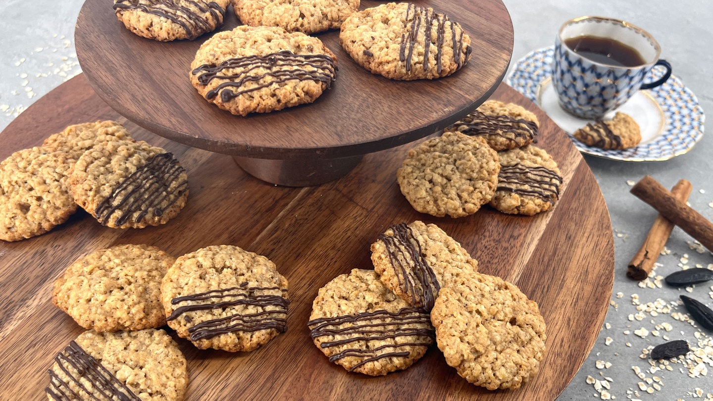 12. Nach dem vollständigen Auskühlen der Kekse auf dem Blech die Kekse mit Kuvertüre filieren. Dafür ein kleines Stück vom gefüllten Spritztütchen abschneiden und in schnellen Bewegungen unregelmässige Schokostreifen über die Kekse laufen lassen. Haferkekse trocknen lassen.