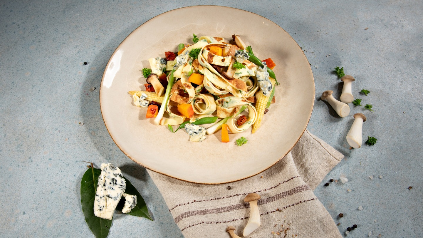 Tipp: Statt Blauschimmelkäse könnt ihr auch Camembert mit Kürbis und Pilzen nehmen. Statt Pfannkuchen passen Buchweizennudeln oder glutenfreie Nudeln sehr gut.