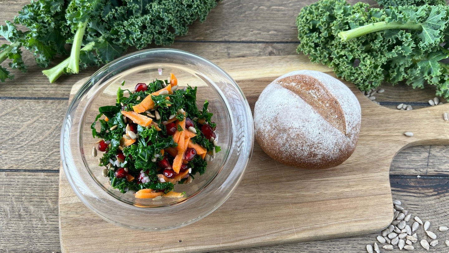 Caroline Autenrieth bereitet einen frischen Salat aus Grünkohl, Karotte und Granatapfel zu. Herrlich knackig, würzig und mit einer feinen Fruchtnote.