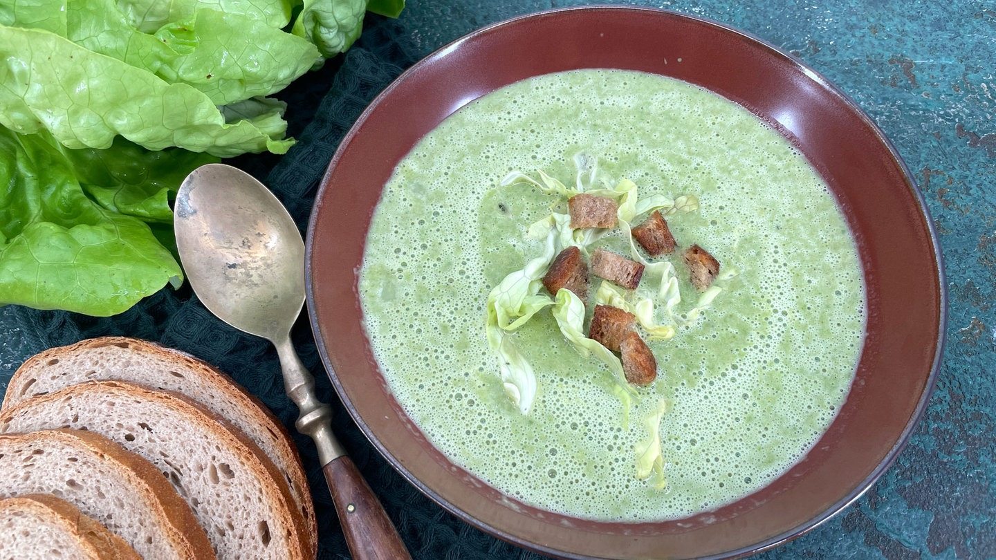 Aus Kopfsalat wird eine Suppe! Verfeinert mit selbst gemachten Croûtons aus Vollkornbrot wird sie zum Geschmackserlebnis.