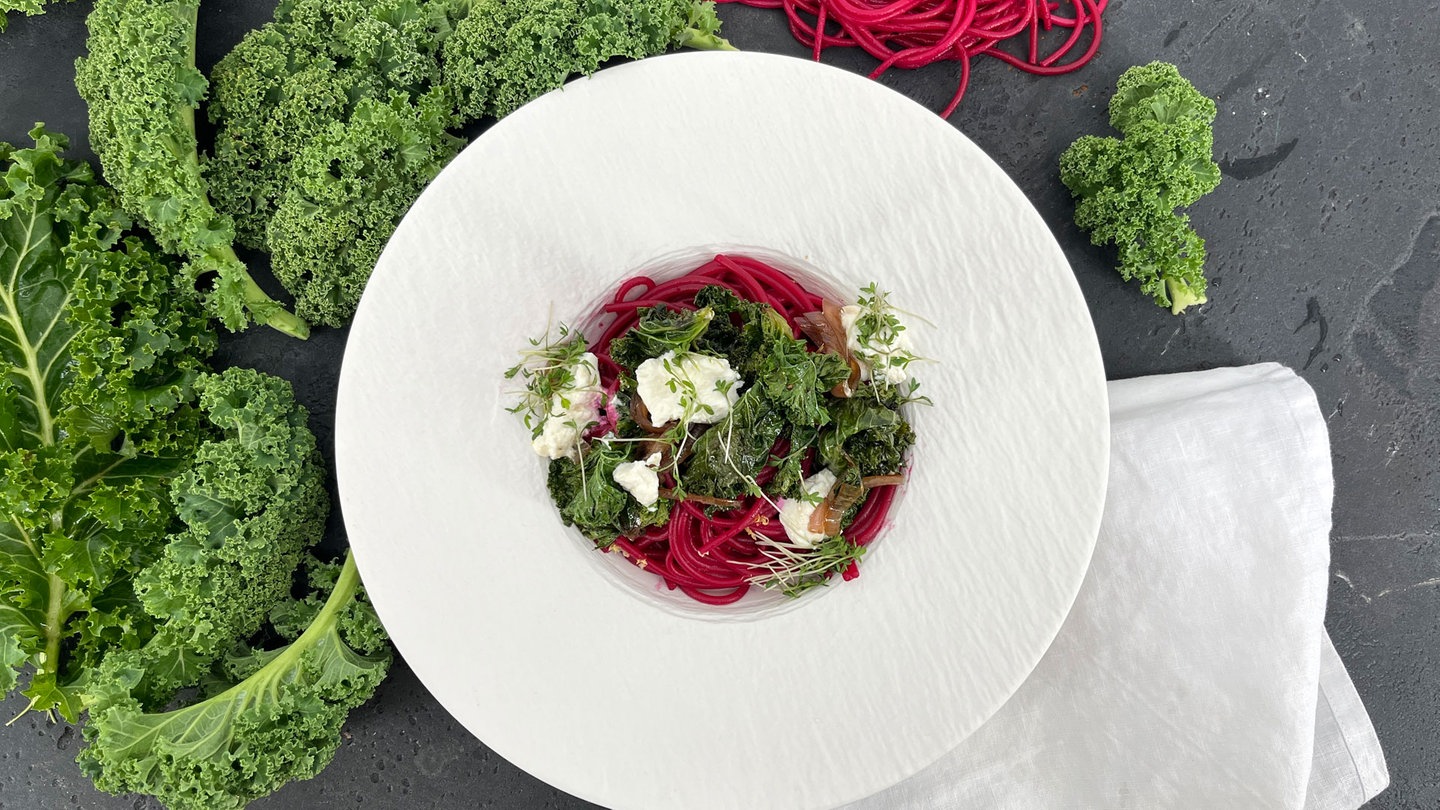 12. Grünkohl in tiefe Teller geben, darauf die roten Spaghetti anrichten, mit Ricotta und Kresse garnieren.