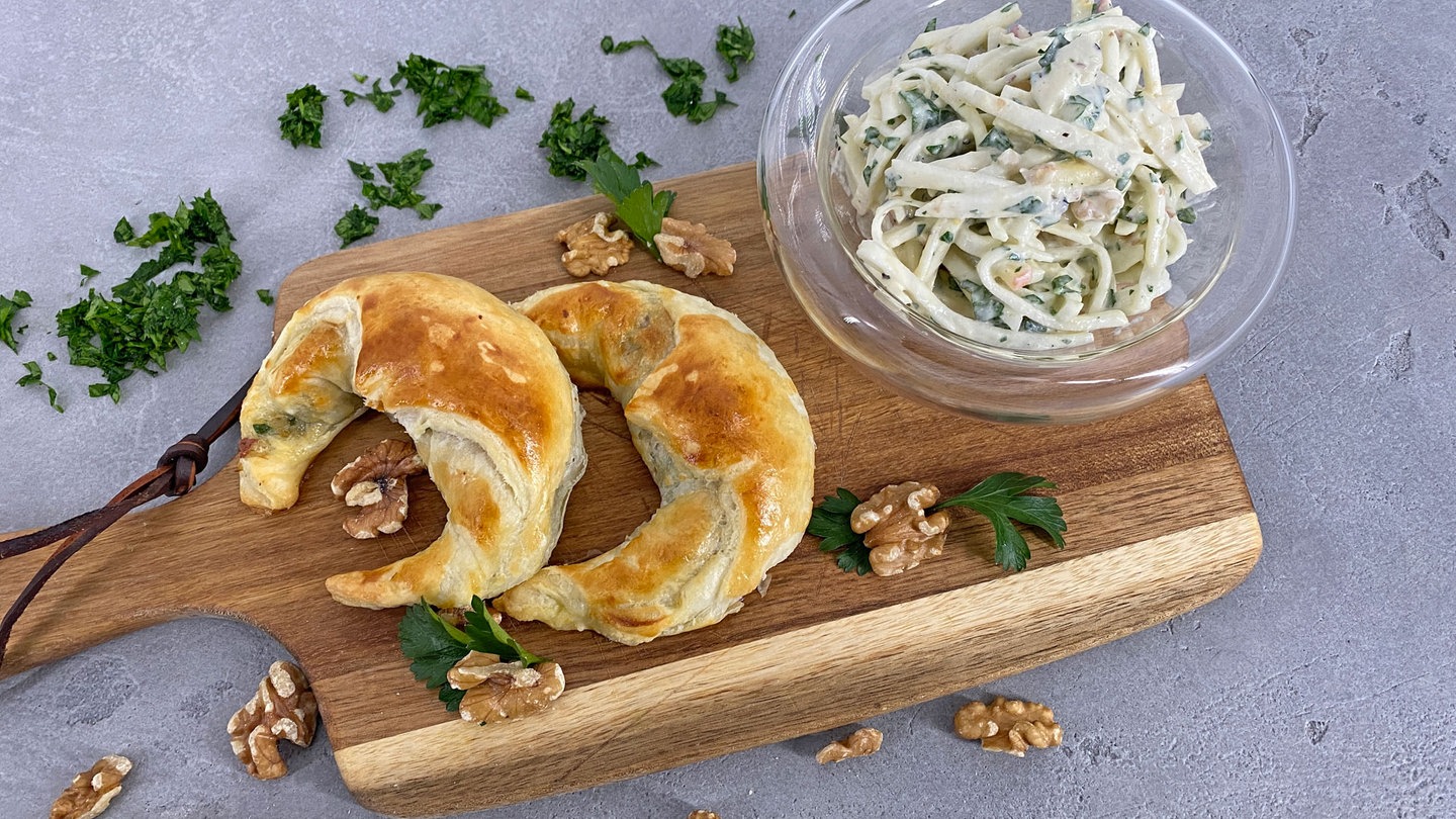 Knusprige Blätterteighörnchen treffen auf herzhaft-fruchtigen Salat. Einfach zubereitet und geschmacklich immer ein Volltreffer!