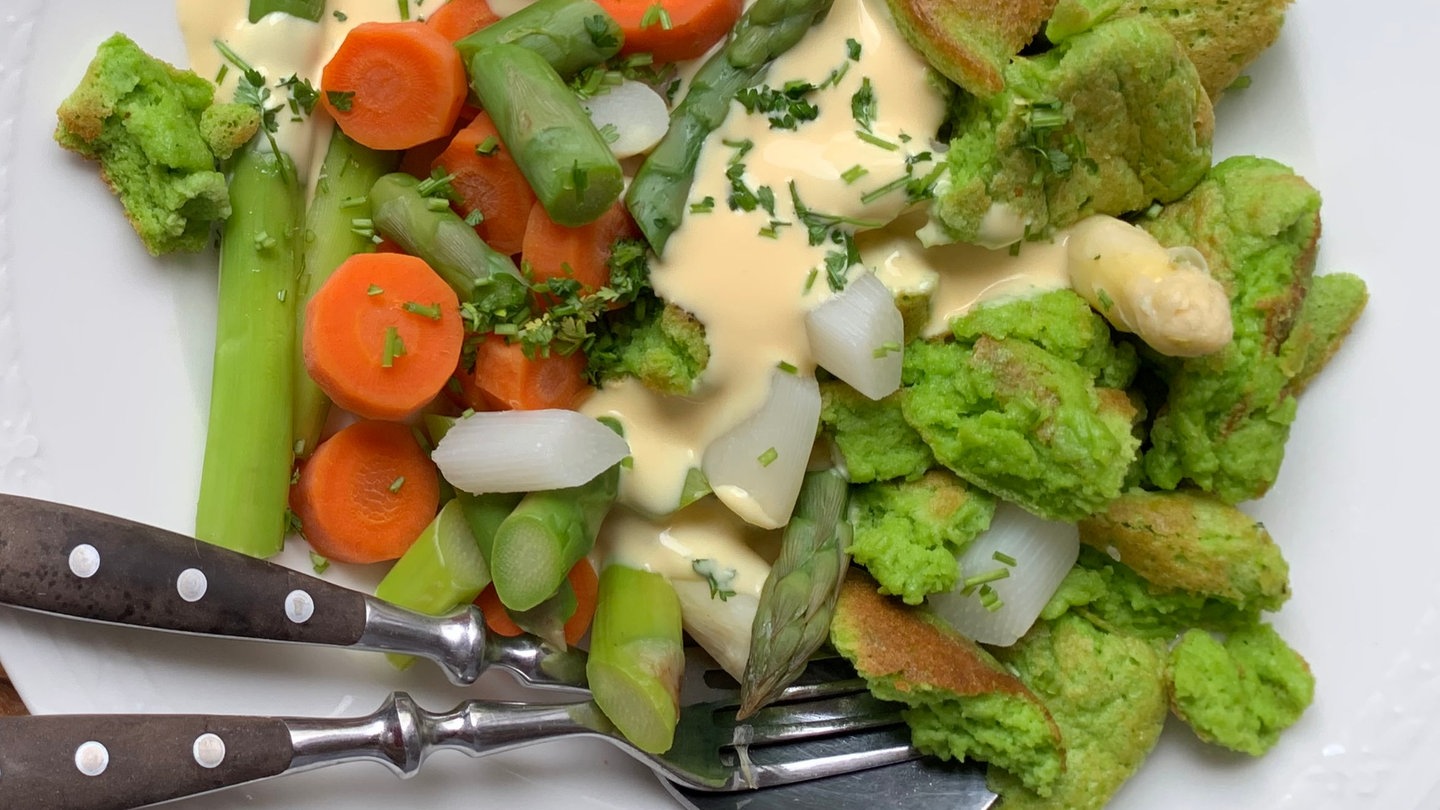 - 250 ml Sauce Hollandaise, Kerbel oder Petersilie zum Servieren