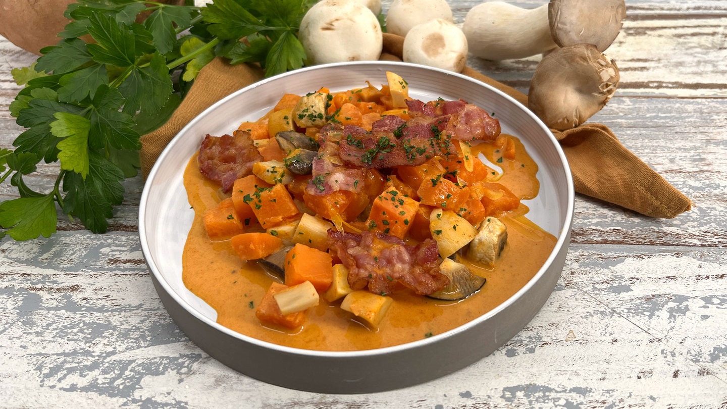 4. Olivenöl in einem großen Topf erhitzen. Süßkartoffeln und Frühstücksspeck zugeben und 3-4 Minuten darin anschwitzen, dann die Pilze dazugeben, mit Salz und Pfeffer würzen und kurz anbraten. Die Gemüsebrühe angießen, so dass alles mit Flüssigkeit bedeckt ist. Zugedeckt alles ca. 8 Minuten köcheln lassen.