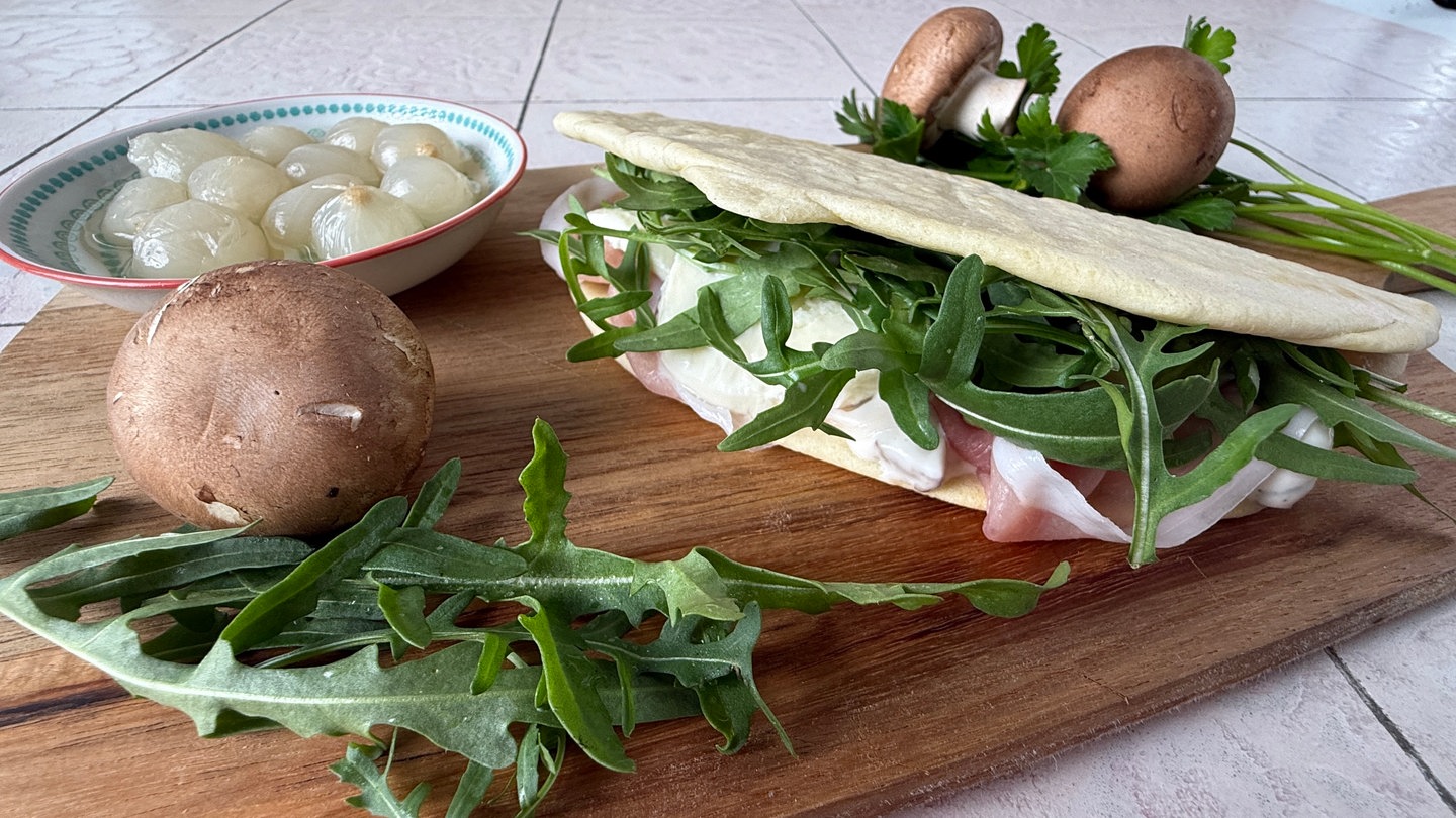 8. Die Fladen mit der Pilz-Mayonnaise bestreichen. Mit Schinken, Mozzarella und Rauke belegen bzw. bestreuen. Nach Belieben mit etwas Salz und Pfeffer würzen, zusammenklappen und warm oder kalt genießen.