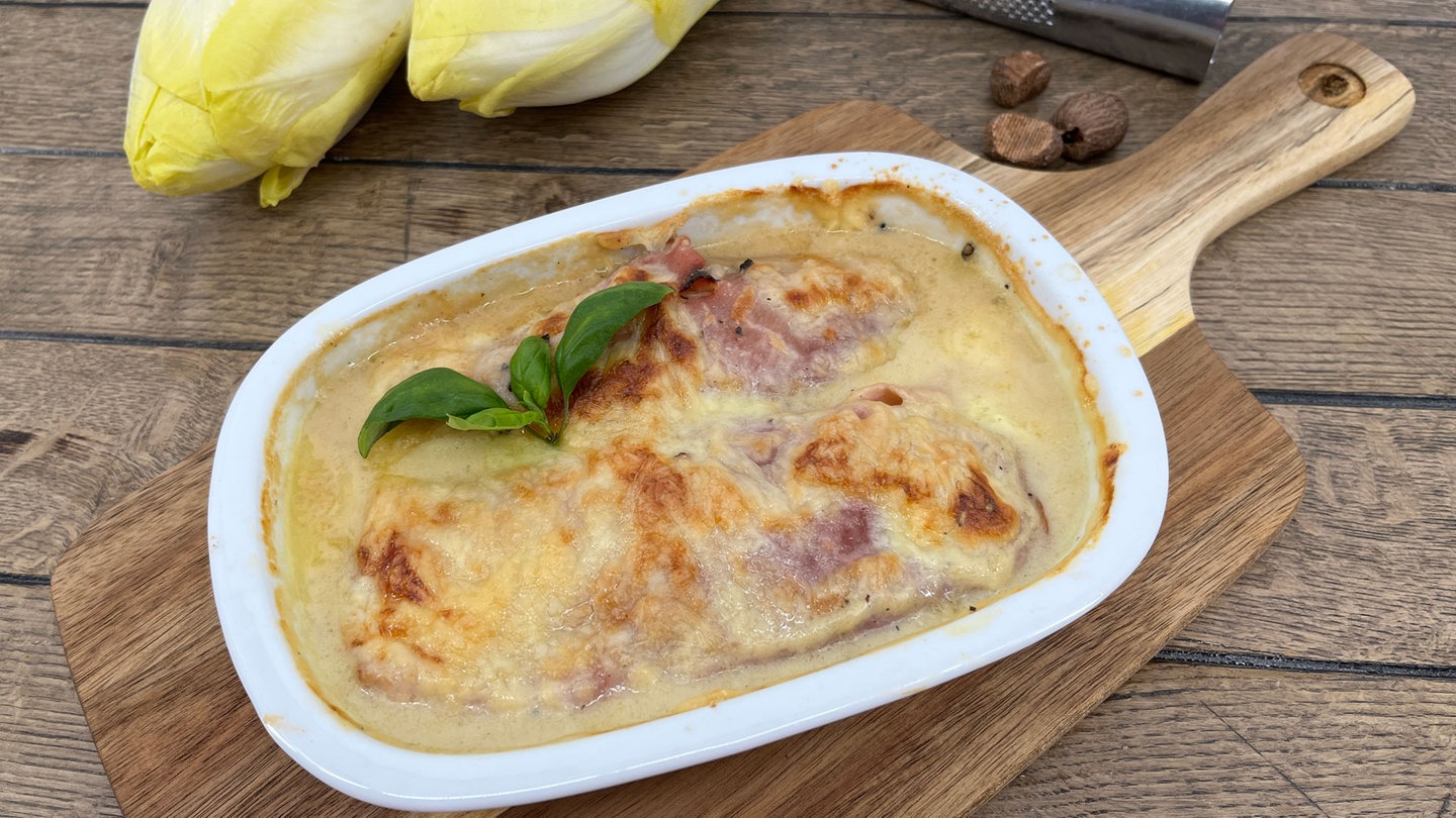 Die Kombination aus zartem Chicorée, umhüllt von würzigem Schinken und überbacken mit einer cremigen Käsesauce, sorgt für ein Geschmackserlebnis der besonderen Art.