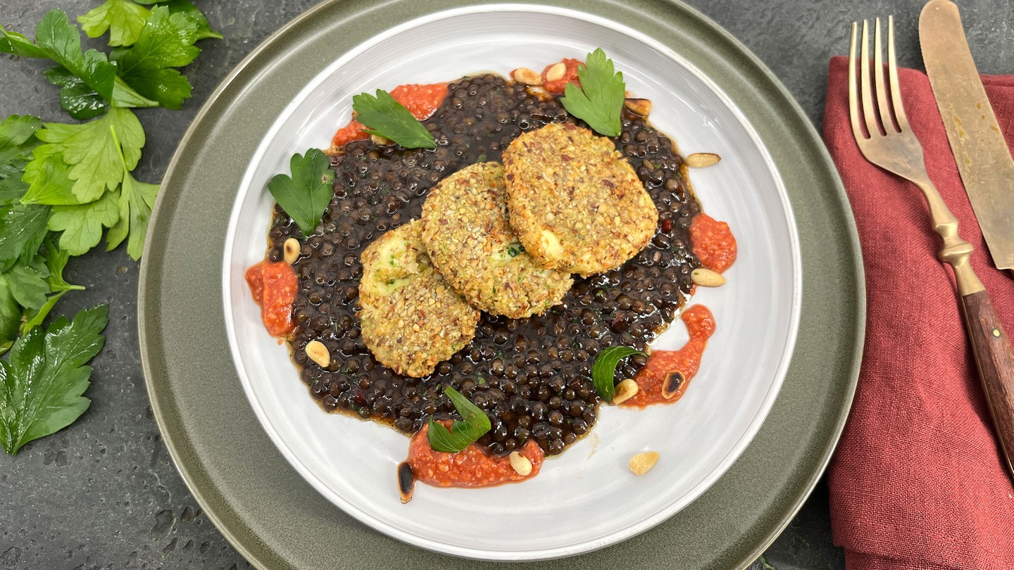 16. Zum Servieren die Linsen auf Teller verteilen und die Mozzarellawürfel darauf anrichten. Das Pesto dazu reichen.