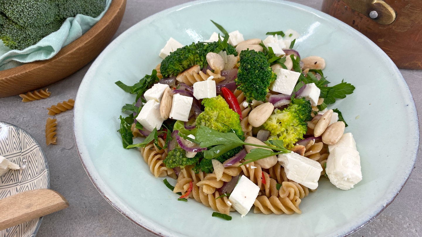 12. Zuletzt Fetastücke und Mandeln unterheben und die Brokkoli-Pasta direkt servieren.