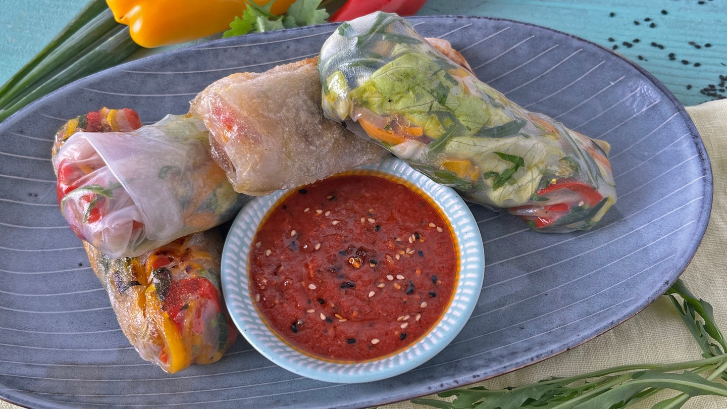 11. Sommerrollen mit dem Chili-Dip anrichten und servieren.