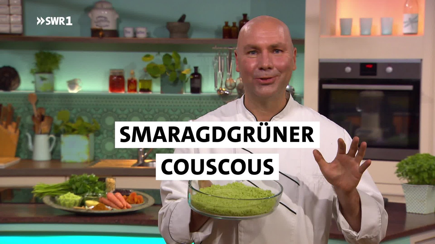 Ein bis zwei Stunden vor dem Servieren einfach mit grünem Kräuterwasser begießen und quellen lassen – durch die Kräuter erhält der Couscous eine Smaragdfarbe. Zum Servieren einfach in der Pfanne mit Gewürzen erwärmen und fertig ist die Beilage.