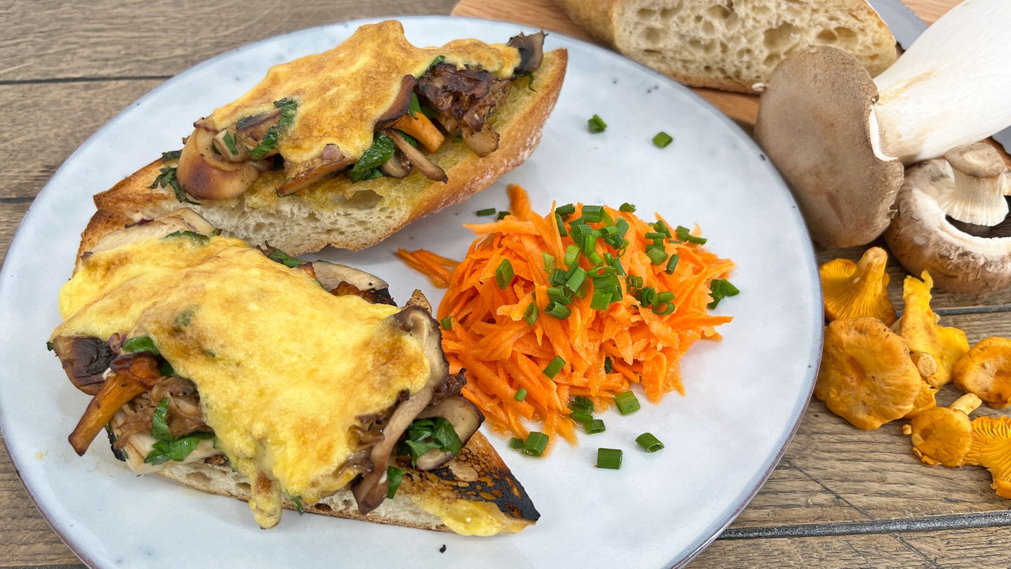 14. Überbackene Toasts auf Teller verteilen, mit übrigem Schnittlauch garnieren. Karottensalat dazu reichen.