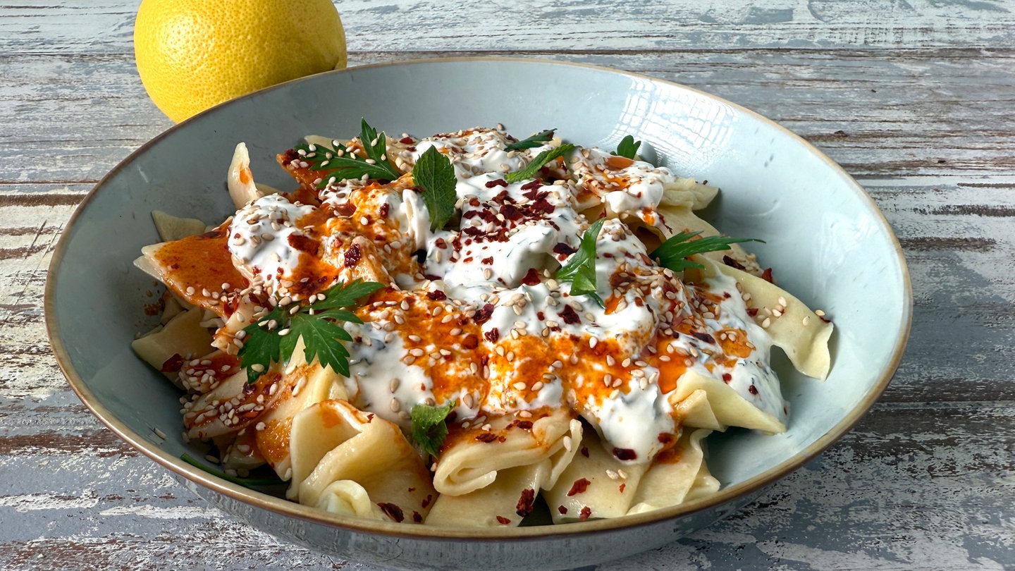 10. Nudeln auf vorgewärmten Tellern verteilen. Mit Joghurt und Paprikabutter anrichten. Mit der übrigen Minze und Sesam bestreuen und servieren.
