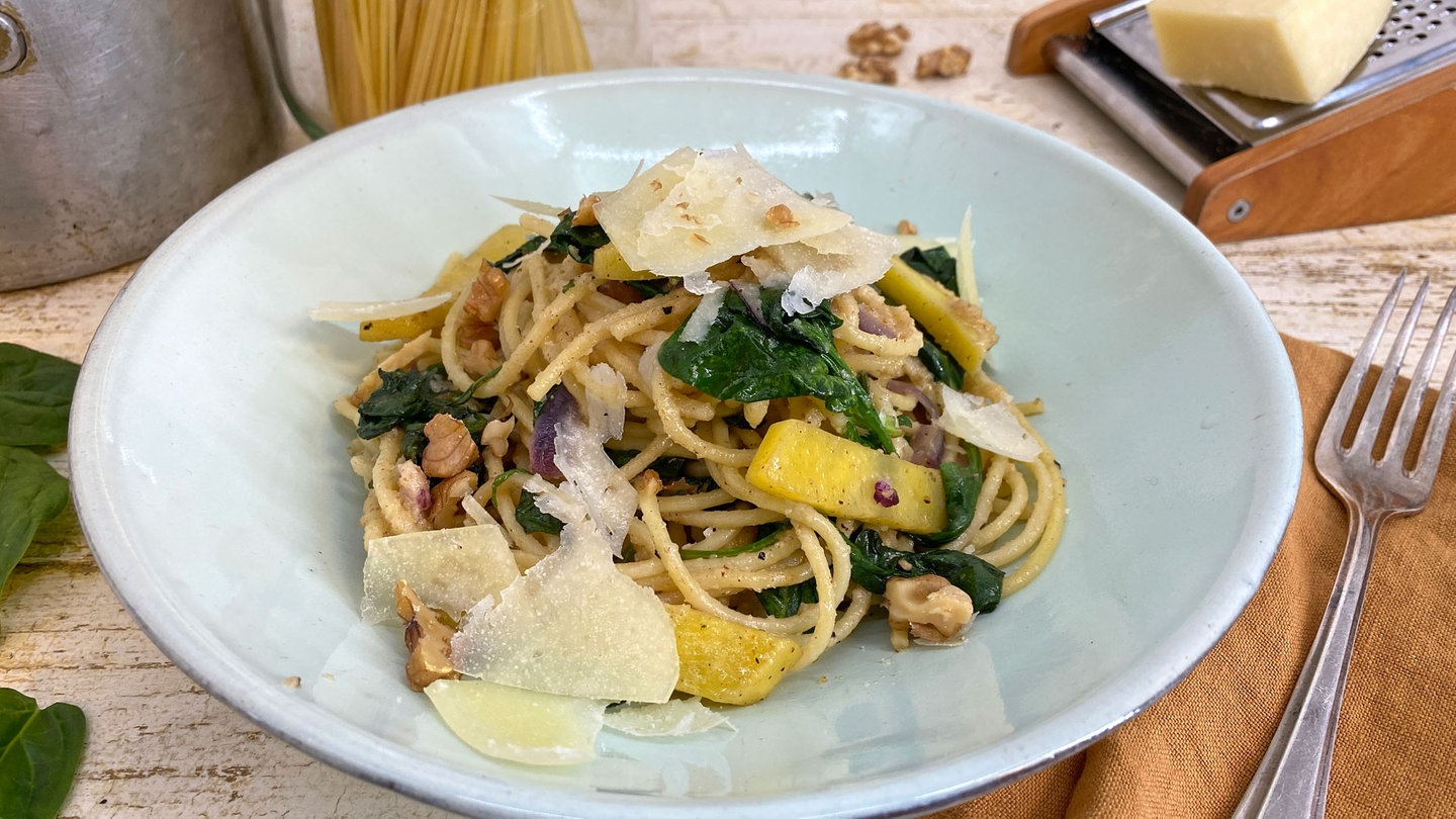 20. Spaghetti und Spinat auf Tellern anrichten und mit dem restlichen Käse bestreuen. Dazu den rote Bete-Salat servieren.