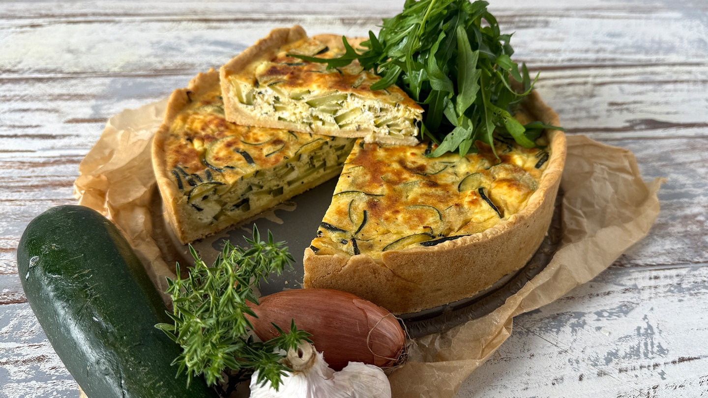 9. Zucchinitarte im Ofen, auf der mittleren Schiene, bei 180 Grad Ober- und Unterhitze, ca. 35-40 Minuten goldbraun backen.