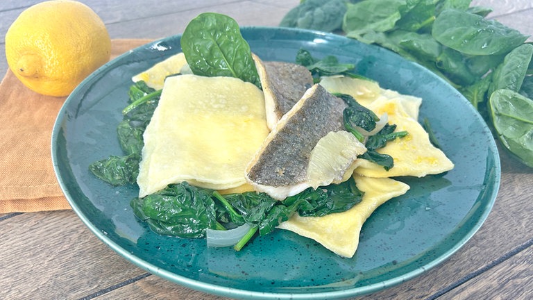 11. Spinat, Ravioli und evtl. gebratenes Fischfilet anrichten.