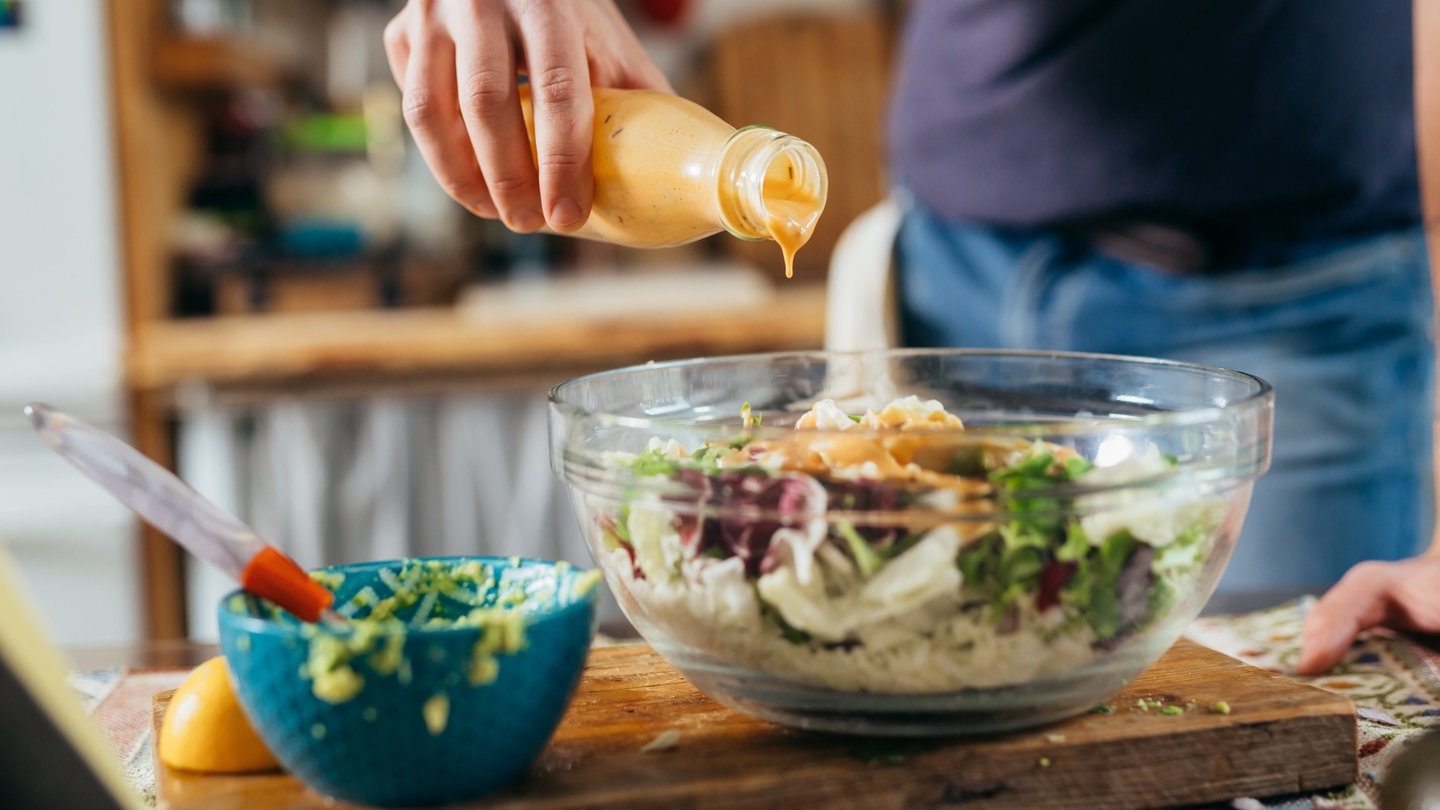 Langweilige Salatsoße, matschige Salatblätter? Wir zeigen, was in Fertigprodukten steckt. Und wie günstig und gesund ein selbstgemachtes Dressing ist – gemixt in acht Sekunden.