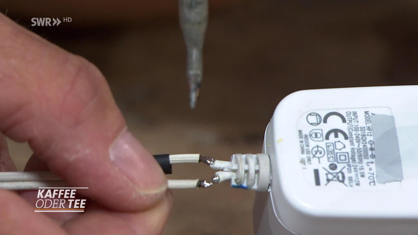 Oftmals gibt es auch einen Kabelbruch an der Stelle, wo die beiden Kabel der Lichterkette ins Netzteil geführt werden. Das Kabel ist meist recht dünn und das Netzteil nach Bauart und Alter, deutlich schwerer. Diese Kombination führt dann schnell zu Brüchen der Kabelverbindung. Auch das kann repariert werden, da es sich ja hierbei um die Schwachstrom-Verbindung handelt.